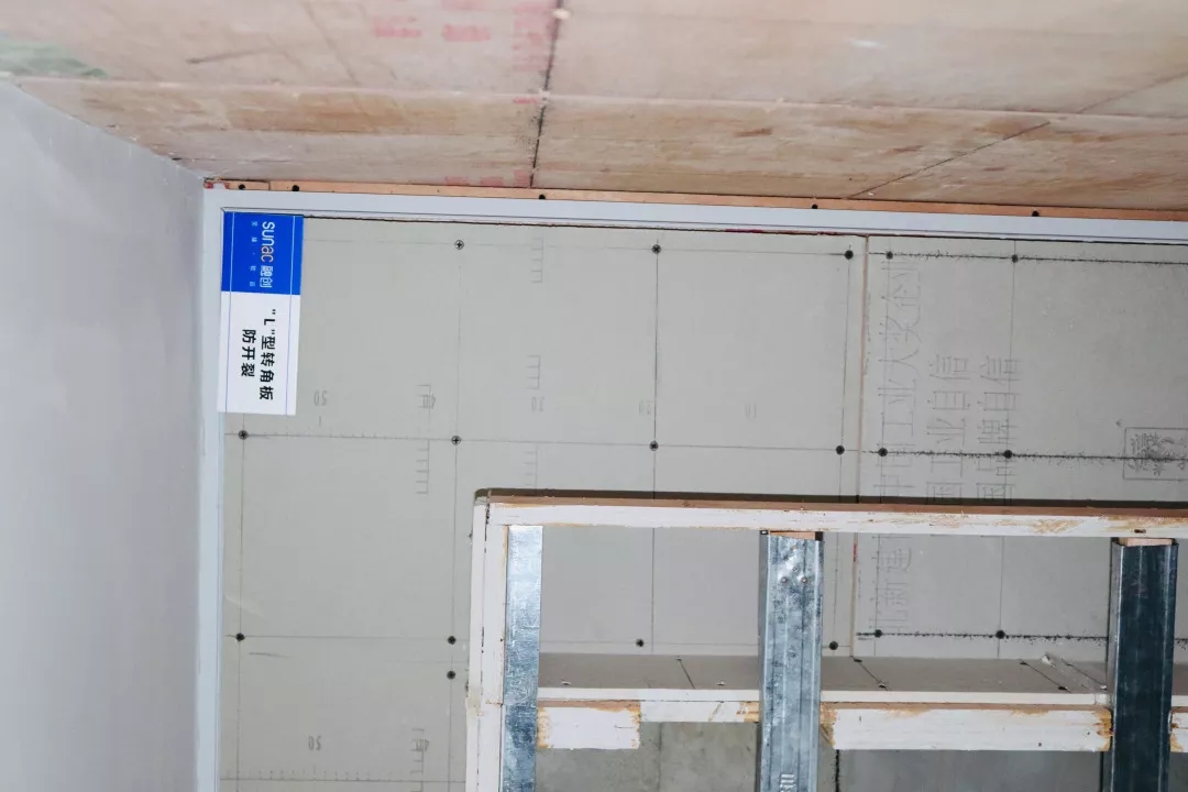 同時燕尾榫后進行背板加固處理,轉(zhuǎn)角處不同于常規(guī)吊頂處理,使用300、600mm的“L”型轉(zhuǎn)角板,以代替第一層石膏板,第二層石膏板進行錯縫安裝,進而使吊頂?shù)慕遣扛邚姸冉雍?,避免開裂。